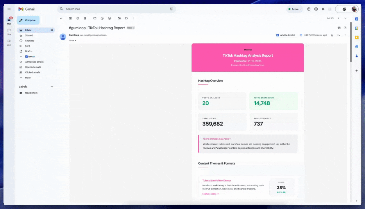 Gumloop then grabs the top videos for that hashtag and runs them through Gemini’s video analysis, identifying creative patterns like visual hooks, editing rhythm, and tone. It pairs those insights with engagement metrics to pinpoint what’s performing and what isn’t.