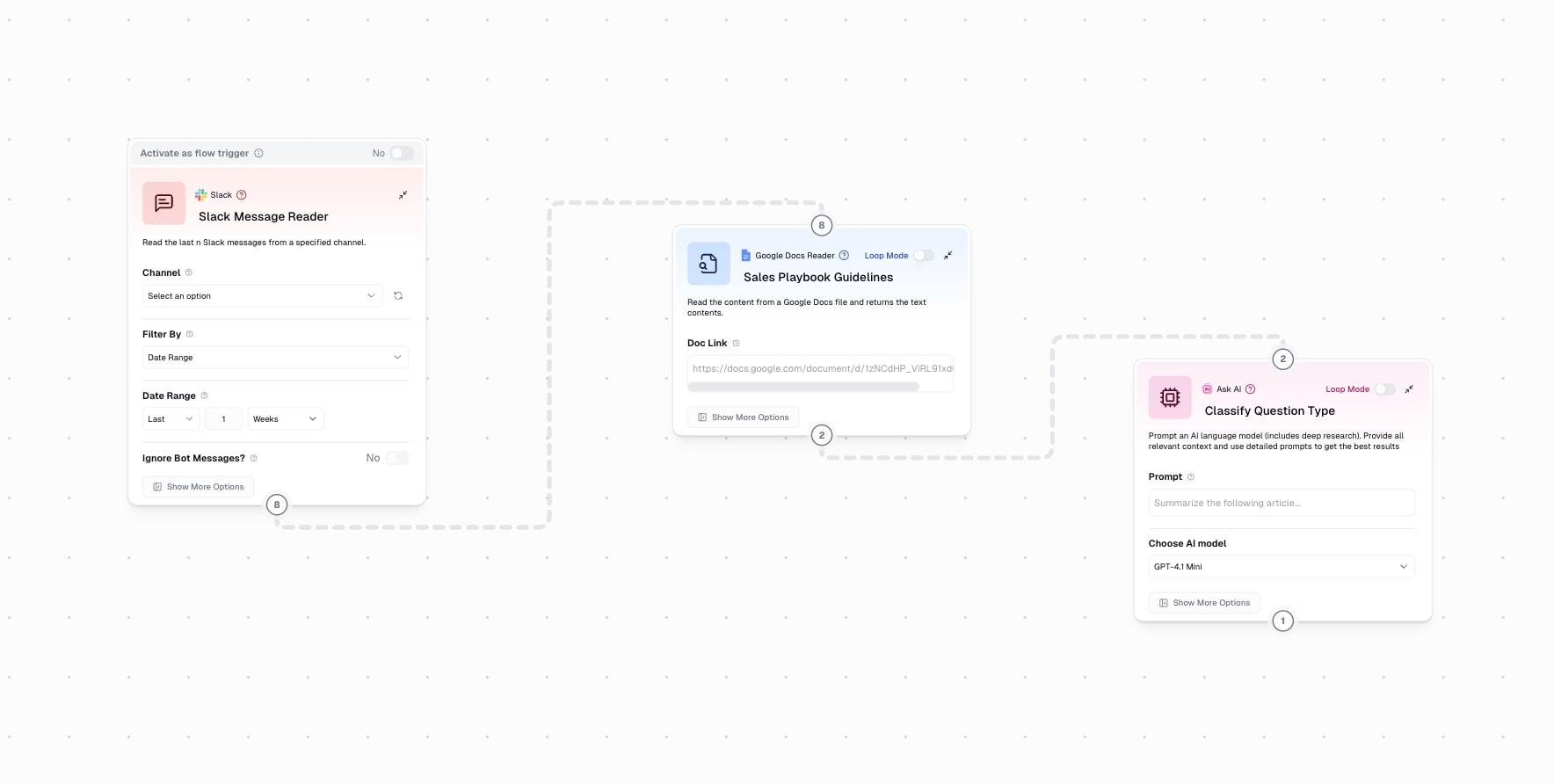 To build this, you add an "extract data" node that pulls the opportunity ID from the message, then connect to Salesforce using an integration node, then pass all that context into your AI prompt. The agent lives right in your flow of work, so your team never has to leave Slack to get what they need.