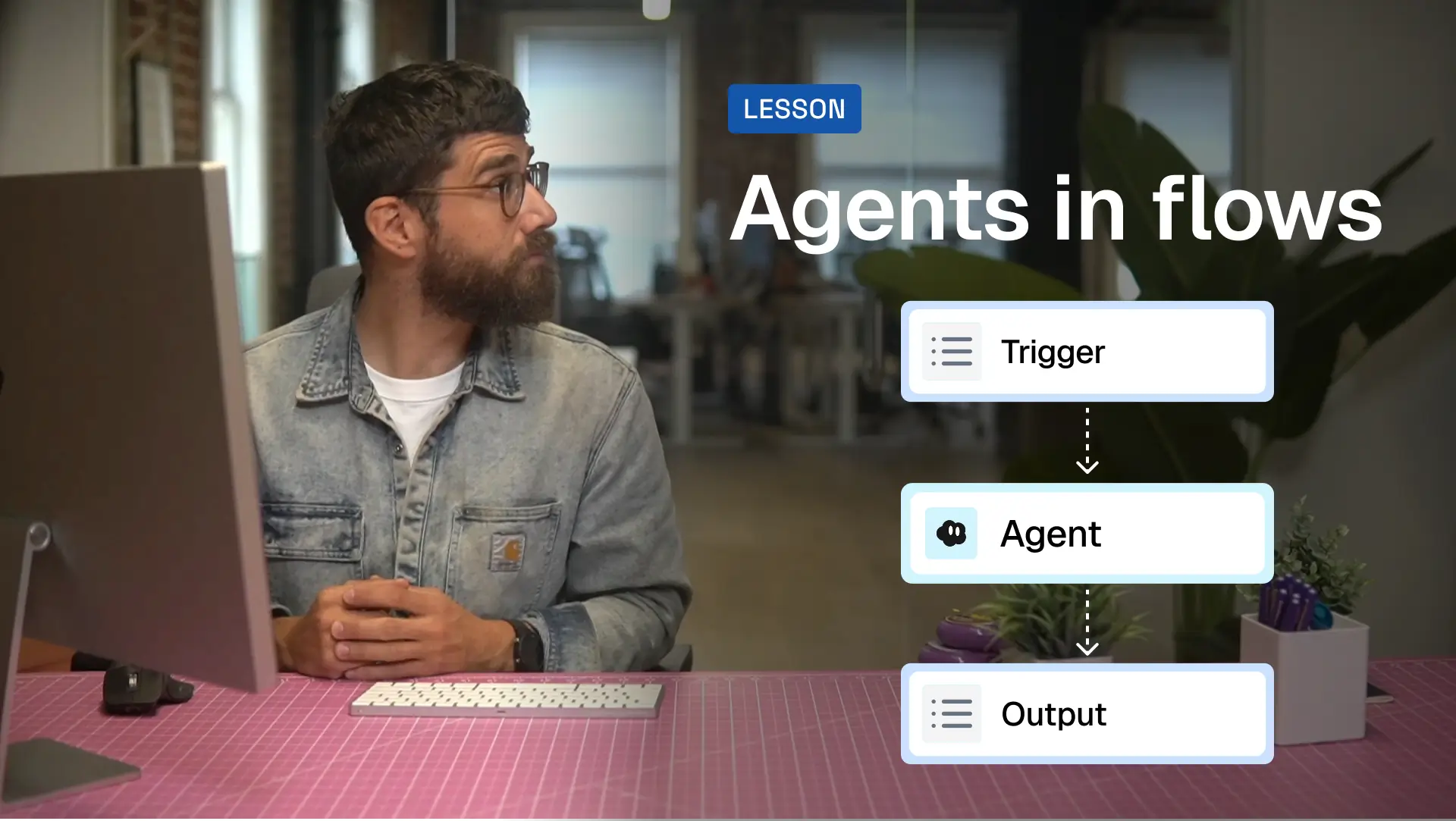 Conditional intelligence – A trigger fires, but you don't know what to do yet. Route it to an agent to categorize, analyze, or decide. The agent outputs a decision, and the flow routes accordingly.